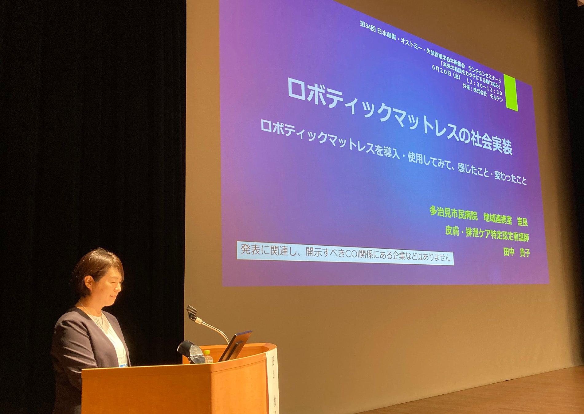 『未来の看護をカタチにする取り組み』をテーマにモルテンと共にランチョンセミナーを開催させていただきました。このテーマはまさに私が東京大学に在職していた頃、10年間にわたってモルテンとの産学連携研究で開発した『レイオス』がモデルになりました。つまり、これが看護にロボットを使う最初の商品であったからです。それは、ICUで防ぎきれない褥瘡(不可避褥瘡)があるという現状への挑戦でした。現東京大学老年看護学の仲上豪二朗教授が、院生や学部生と共に開発し、それには10年かかりましたが確かにICUの褥瘡を劇的に減らすことができました。