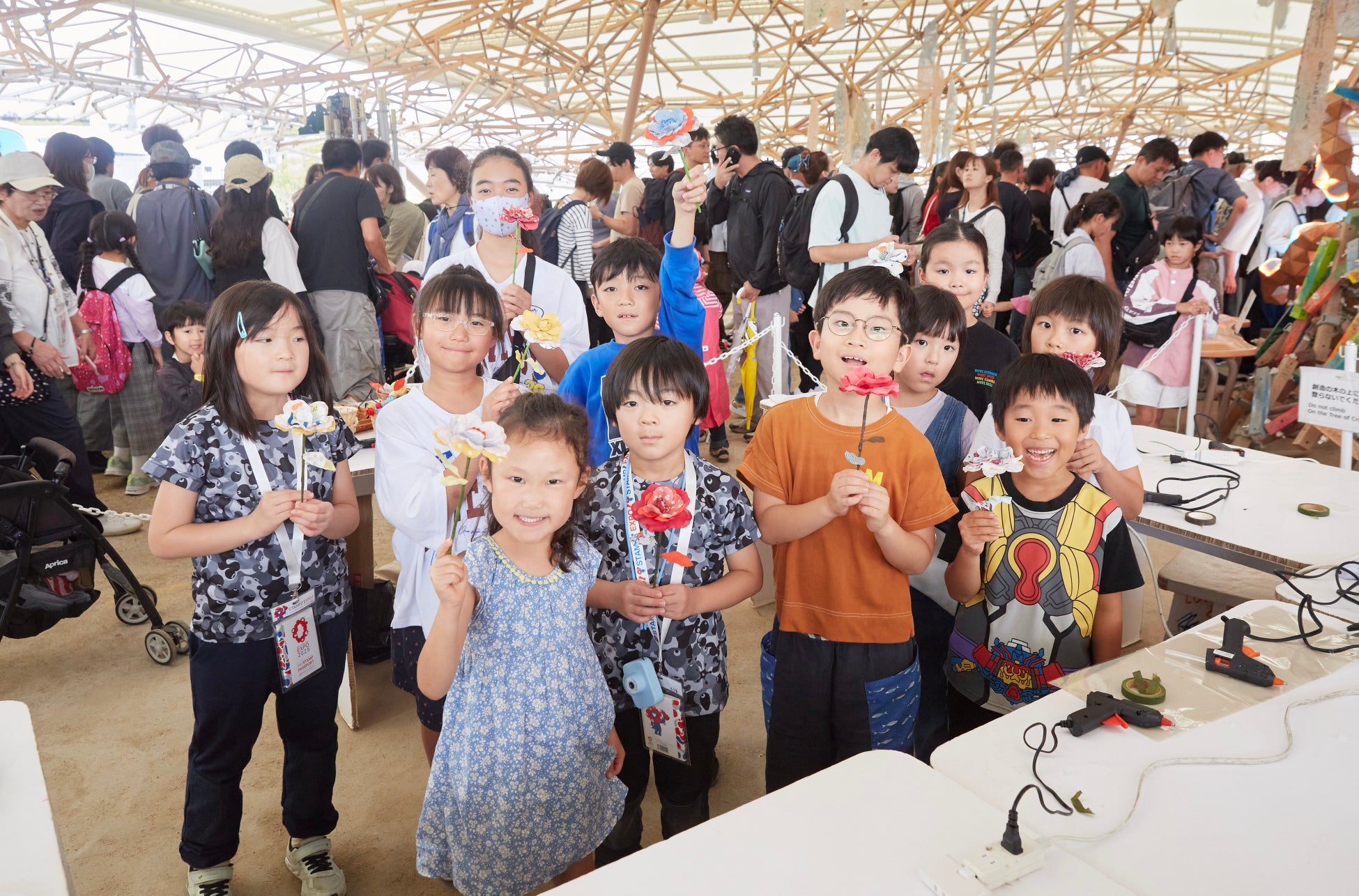 「どこに飾ろうかな〜」「こんなにきれいなお花ができたよ!」といった声があふれ、参加者の想いやセンスが詰まった花々が咲き誇りました。各回の最後には、完成したお花を集めて記念撮影。カラフルで個性豊かな花たちが並び、にぎやかな万博会場に温かな彩りを添えました。