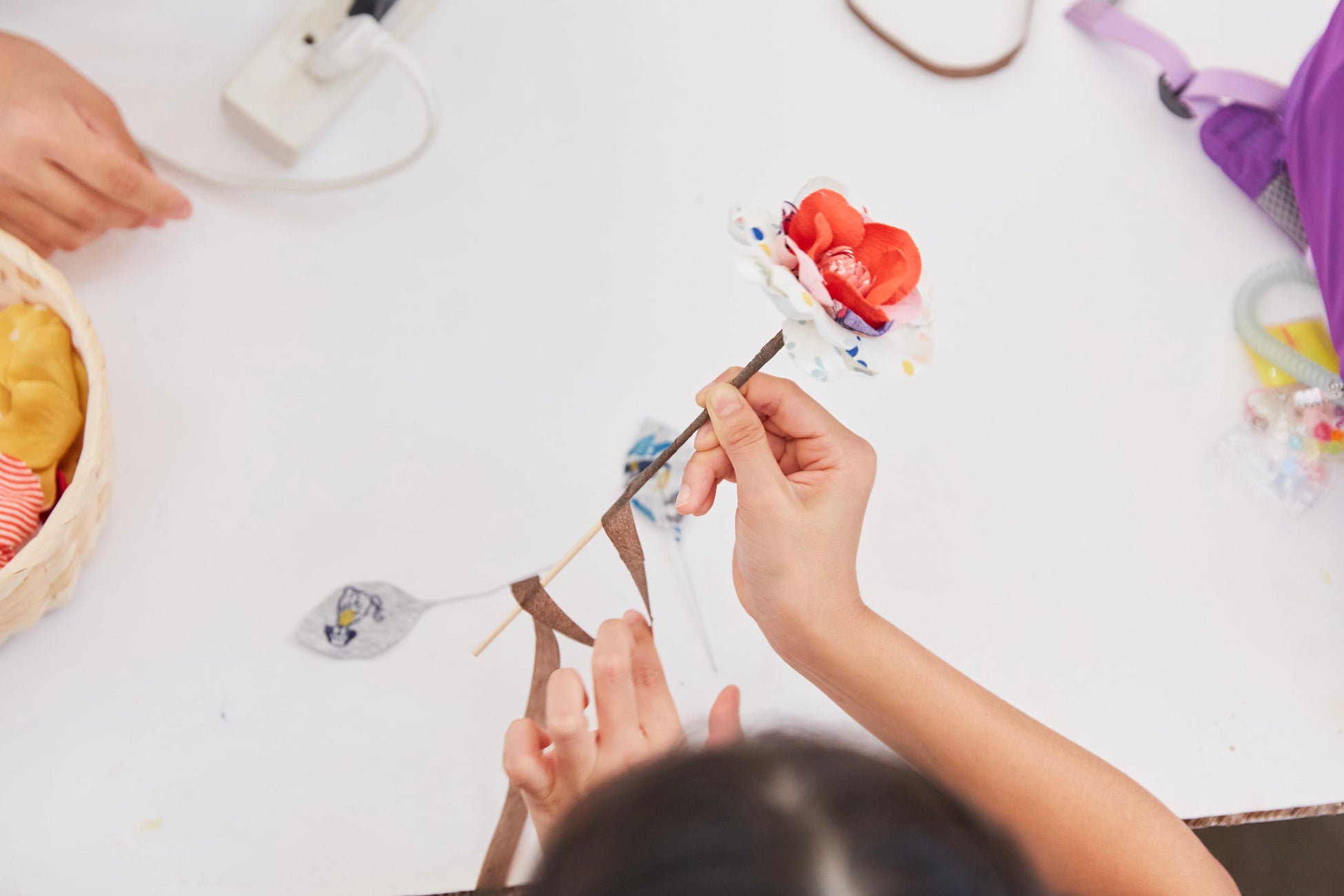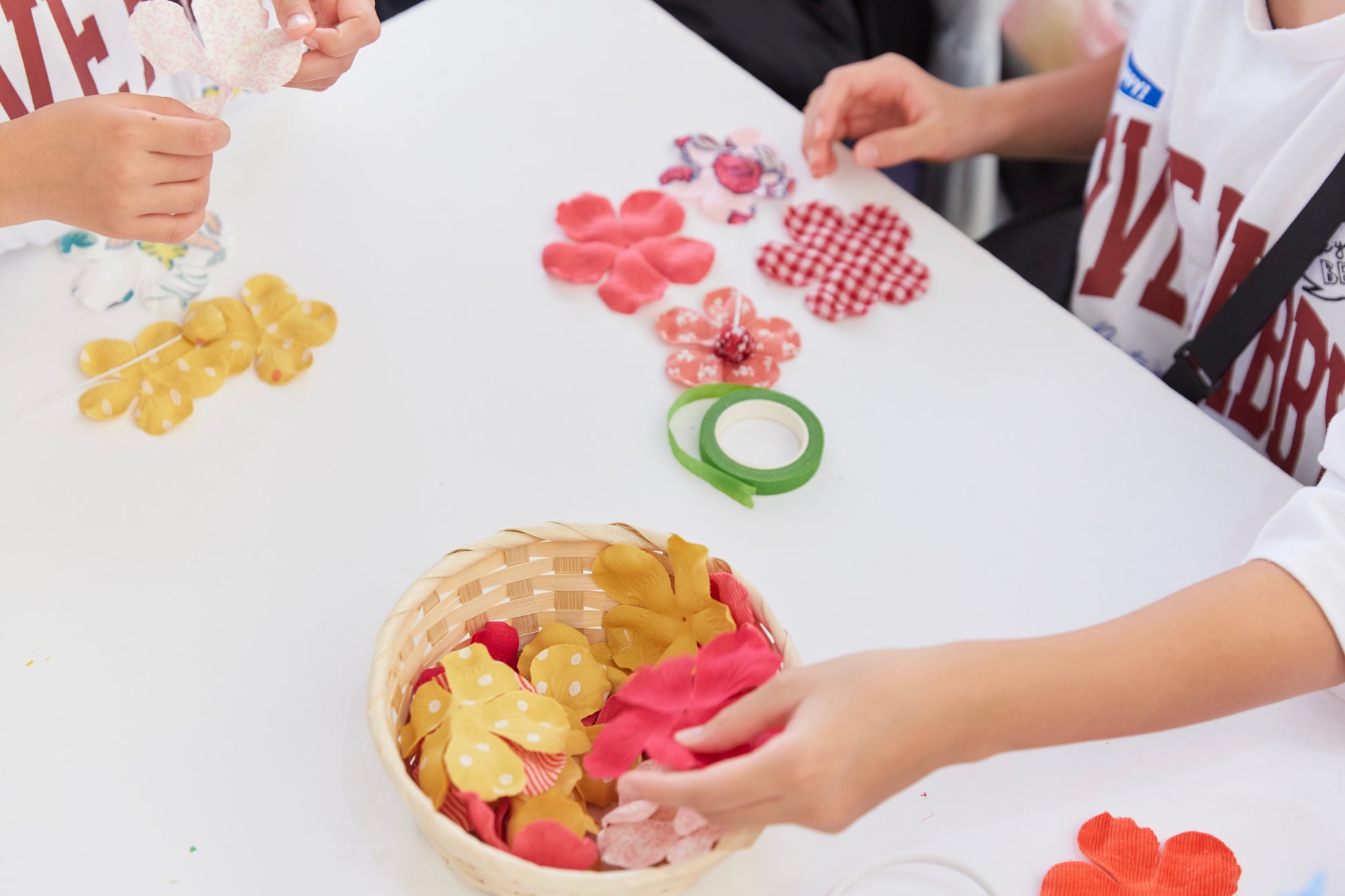 本プログラムは、規格外品や販売が難しくなった洋服や再販困難なセカンドハンド品の端切れをアップサイクルし、子どもたちが世界にひとつだけの“お花”を制作する体験型イベントです。当日は4回すべてのワークショップが大盛況となり、合計で53名のお子さまが参加しました。「古いものから新しいものを生み出す」体験を通して、子どもたちは“ものを大切にする心”や“つくる喜び”を感じる機会となりました。