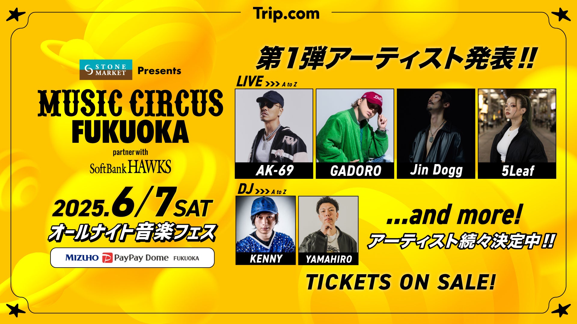 株式会社MUSIC CIRCUS(東京都渋谷区)は、福岡ソフトバンクホークス株式会社(福岡市中央区)と開催する、音楽フェス「STONE MARKET Presents MUSIC CIRCUS FUKUOKA partner with SoftBank HAWKS」の第1弾出演アーティストを発表いたします。