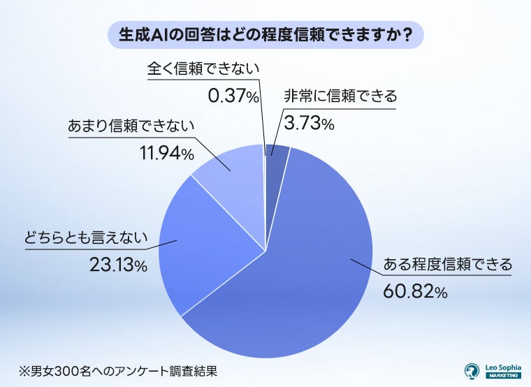 生成AIに対する信頼度を調査した結果、「ある程度信頼できる」と回答した人は60.82%に達し、生成AIが実用的かつ利便性の高いツールとして認識されていることがわかりました。