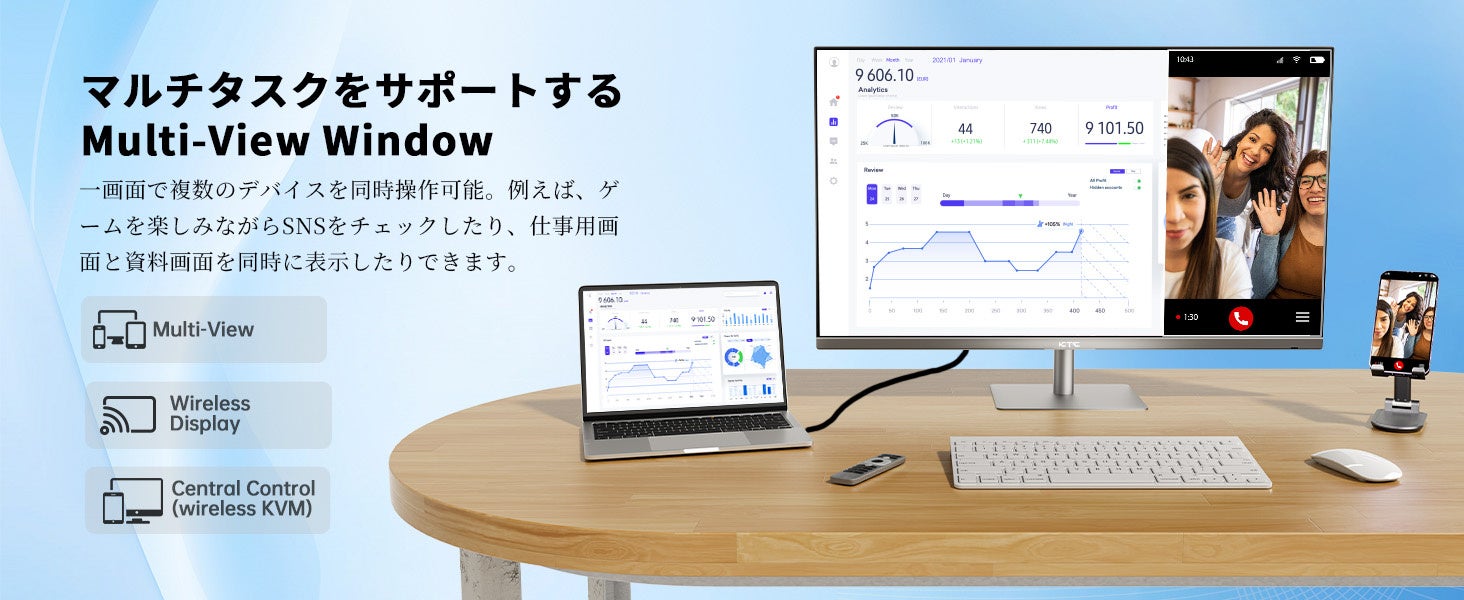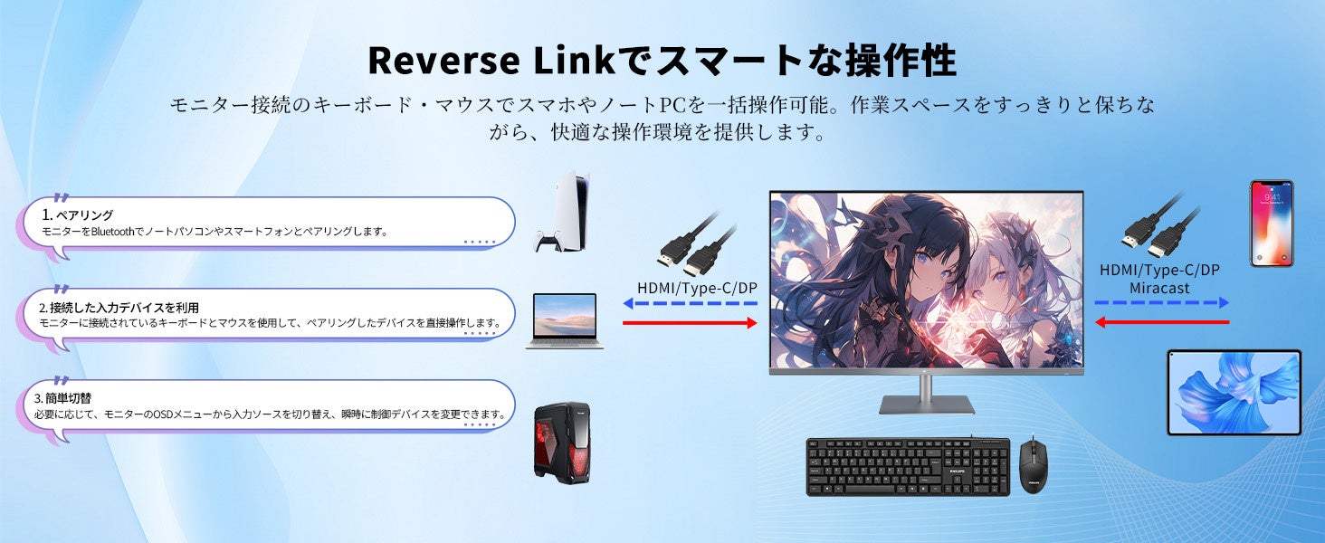 モニターに接続したキーボードとマウスを通じて、ノートPCやスマホをBluetoothでコントロール可能。煩わしいケーブルが減り、すっきりとした作業スペースを保ちながら、生産性を最大化できます。