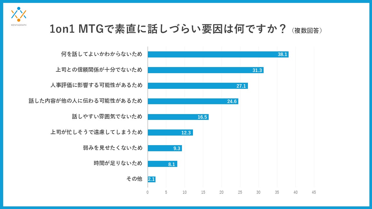 さらに、「率直に話せない理由」についての質問では、複数回答で「何を話してよいかわからない」(38.1%)「上司との信頼関係が十分でない」(31.4%)、「人事評価に影響する可能性がある」(27.1%)、「話した内容が他の人に伝わる可能性がある」(24.6%)に加え、「話しやすい雰囲気でない」(16.5%)といった回答が上位に並びました。評価や守秘への不安、場の雰囲気の硬さに加えて、そもそもアジェンダ設計が不十分なために“話題の入口”が見つからないという運用上の課題が浮き彫りになっています。