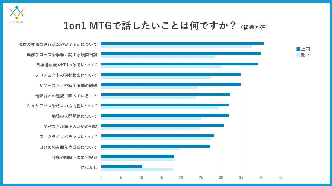 ワークライフバランスについては、部下では5位(27.6%)に位置づくのに対し、上司では10位(28.3%)と順位に大きな差が出ています。上司側では他の業務寄りテーマが相対的に上位を占めるため、ワークライフバランスが議題として後回しになりやすい構造になっていることが推察されます。すなわち、上司は業務の進行・プロセス・KPIに重心が置かれやすく(上位:現行業務40.7%、プロセス40.0%、KPI39.3%)、部下は業務テーマに加えてキャリアやワークライフバランスといった“自分の将来・生活基盤”に関わるテーマへのニーズが強いという結果になり、上司と部下の間で認識ギャップが生まれている可能性がわかりました。