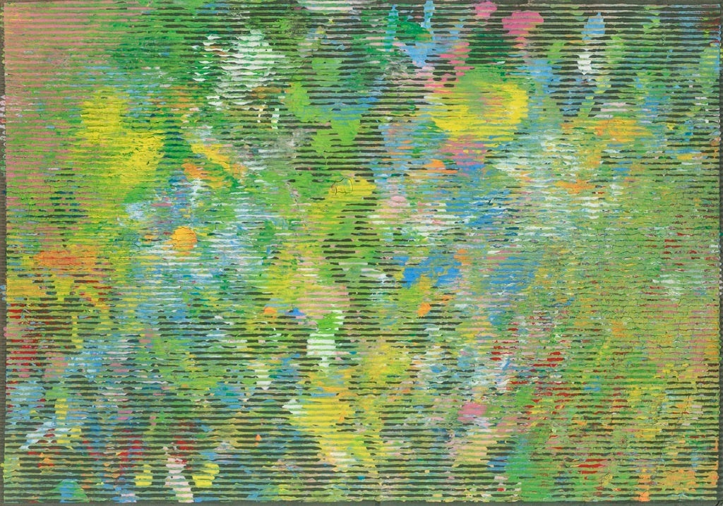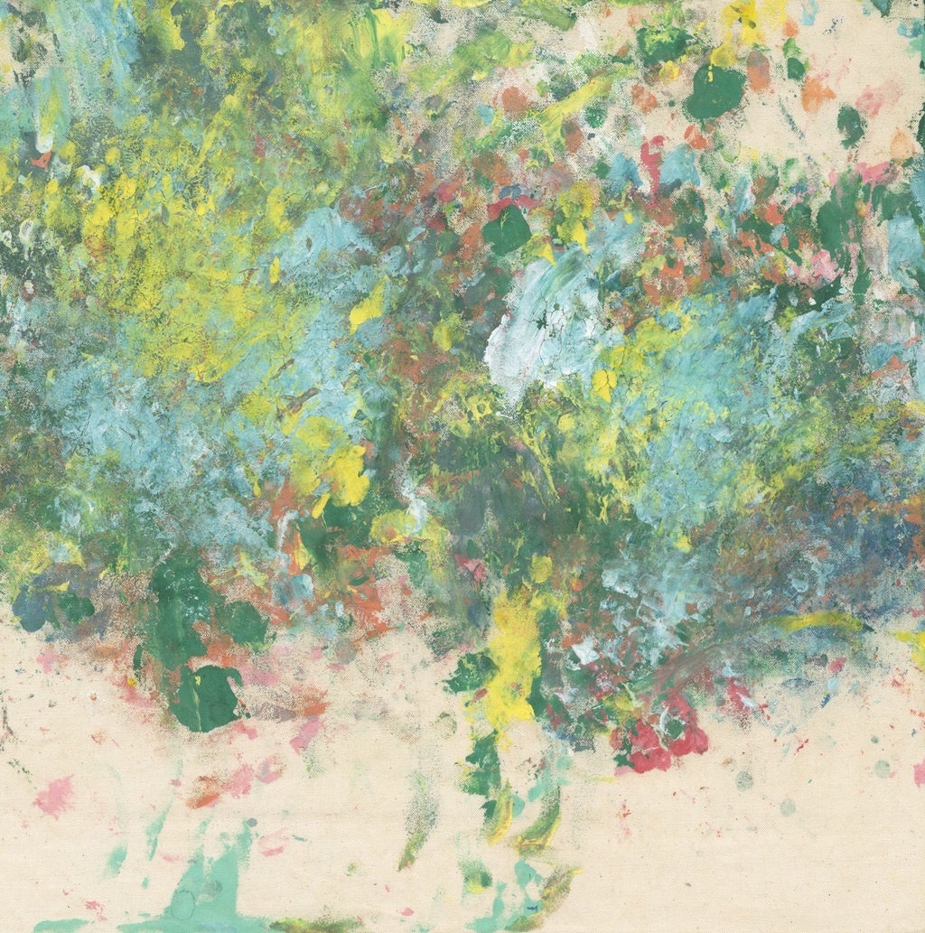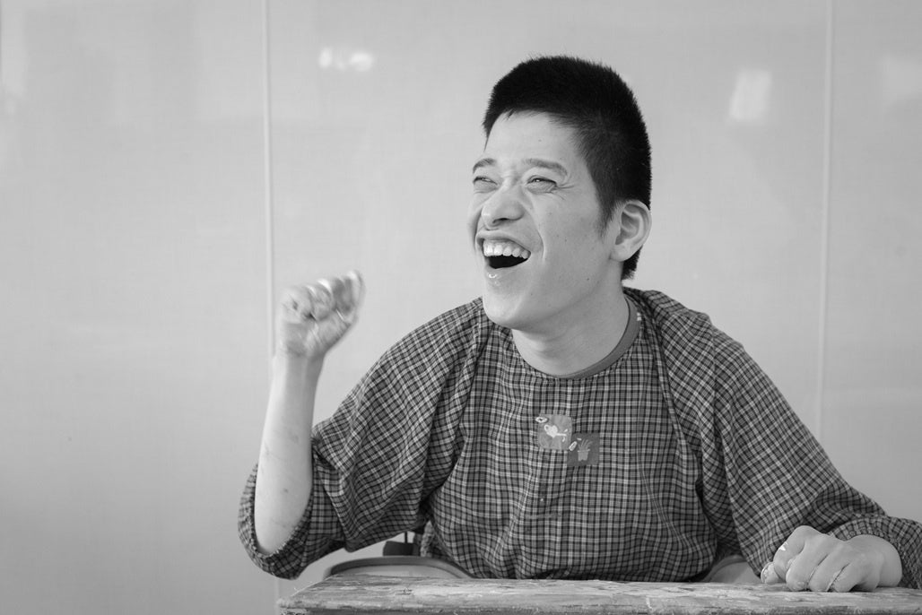 はじまりは、両手にたっぷりの絵の具をつけること。キャンバスに向かい、大きく指を広げ叩くように描いていく。音楽が大好きで、手拍子が響く賑やかな空間や、大好きな音楽が流れる環境を好み、全身でリズムを取りながら制作するその姿はまるでドラマーのよう。利き手の左手で強く叩いた跡が残ることもあり、そこに生まれる形や質感も作品の一部となる。モチーフは楽しかった思い出や人との関わりで、出来上がった作品からは、たくさんの音が聞こえてくるようだ。