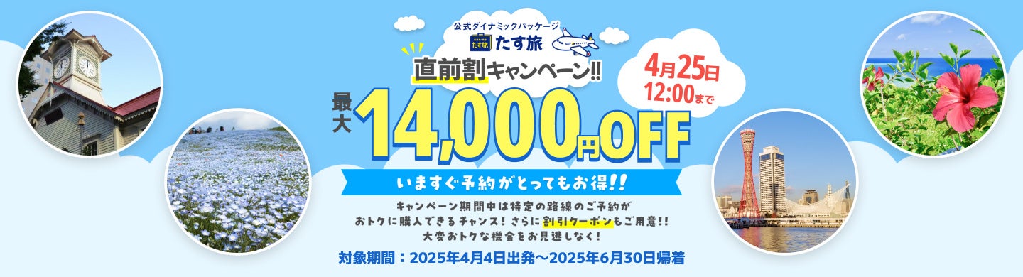 4月~6月限定【直前割キャンペーン!!】で最大14,000円OFFクーポンが利用可能!《スカイマーク公式》ダイナミックパッケージ『たす旅』に直前予約もお任せ!