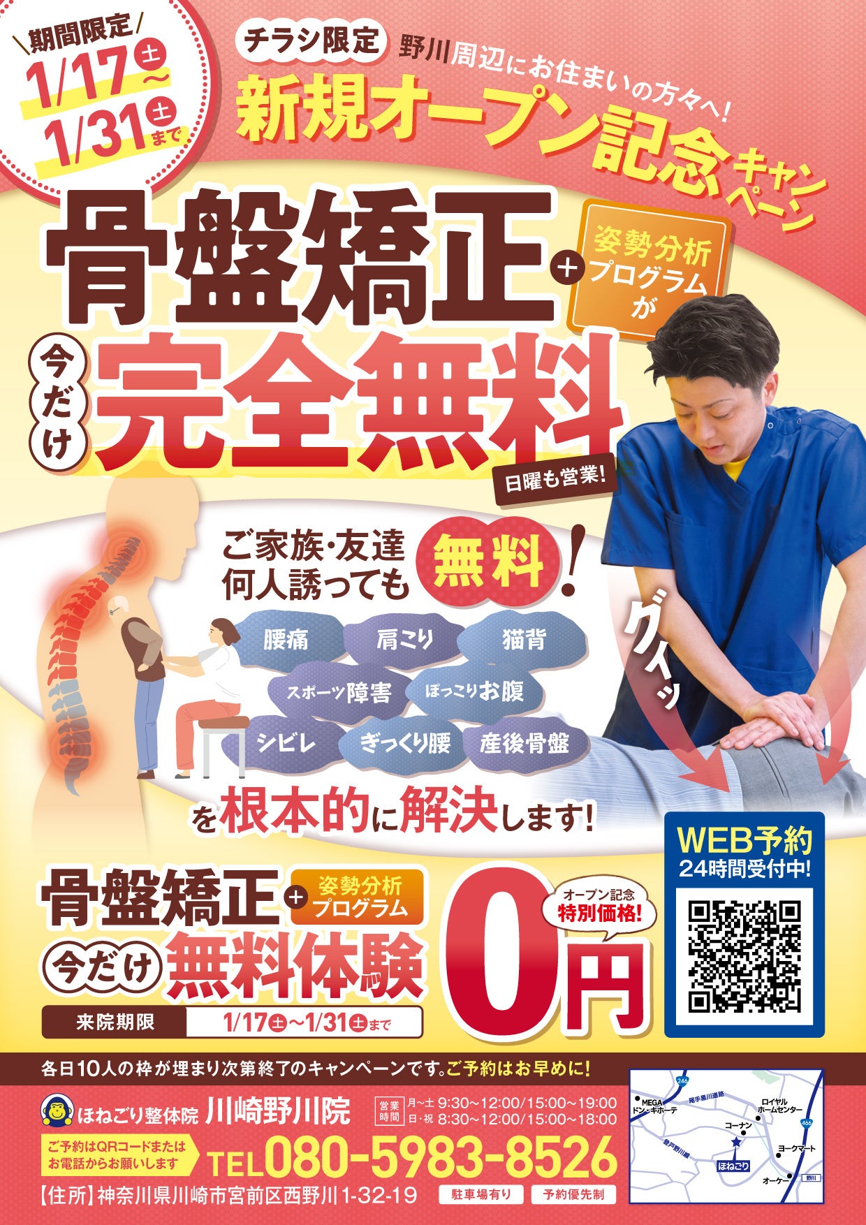 オープンを記念し、地域の皆様の健康課題を可視化・改善するため、ほねごり独自の姿勢分析と骨盤矯正または猫背矯正が無料で受けられる 「オープン記念キャンペーン」を1月31日(土)まで開催いたします。