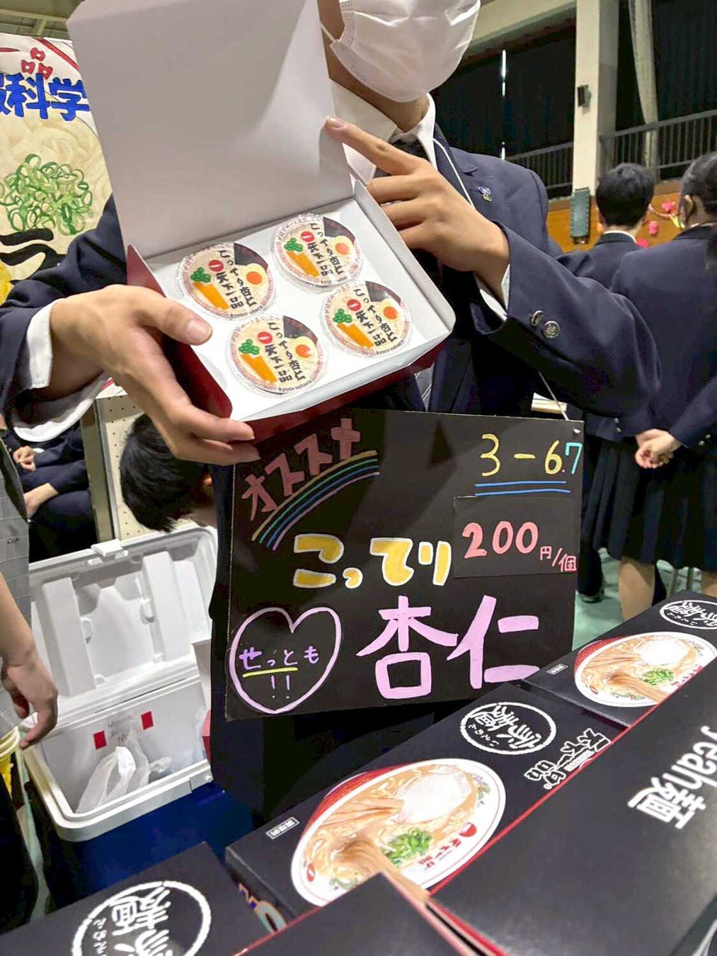 みんなで考案したデザインのパッケージの「天下一品 家麺」「こってり杏仁」を販売しました。