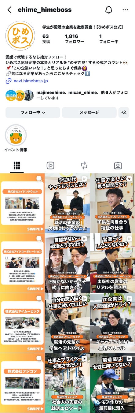 今回リニューアルして「ひめボス」Instagramでは、「ひめボス宣言事業所」となっている県内企業を紹介しています。これらの投稿を通じて、県内就職を検討する大学生に、愛媛で働く人々のリアルな声を届け、就職先選びの一助となることを目指します。