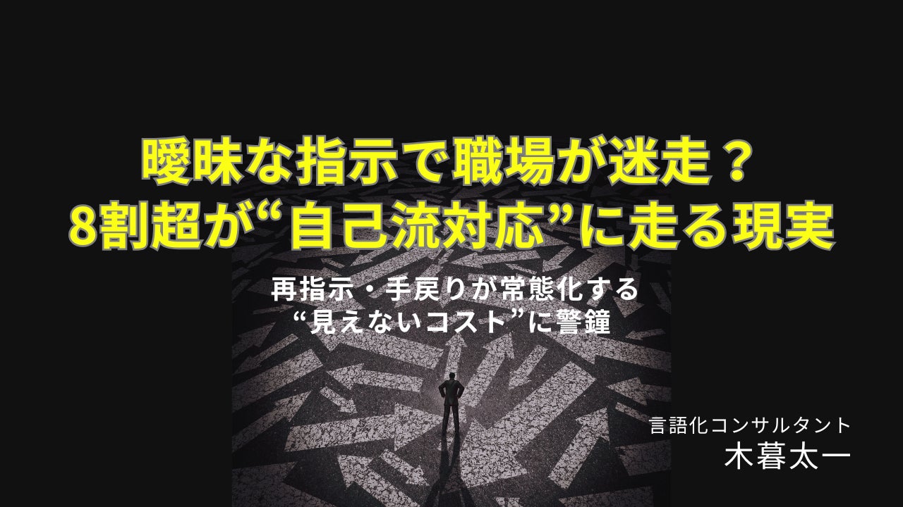 言語化コンサルタントの木暮太一は、自身の会員や講演参加者を対象に独自調査を実施し、現場の職場で蔓延する”曖昧な指示”と、それに伴う”自己流解釈”による混乱の実態を明らかにしました(有効回答数:354名/調査期間: 2025年4月15日~4月30日)。