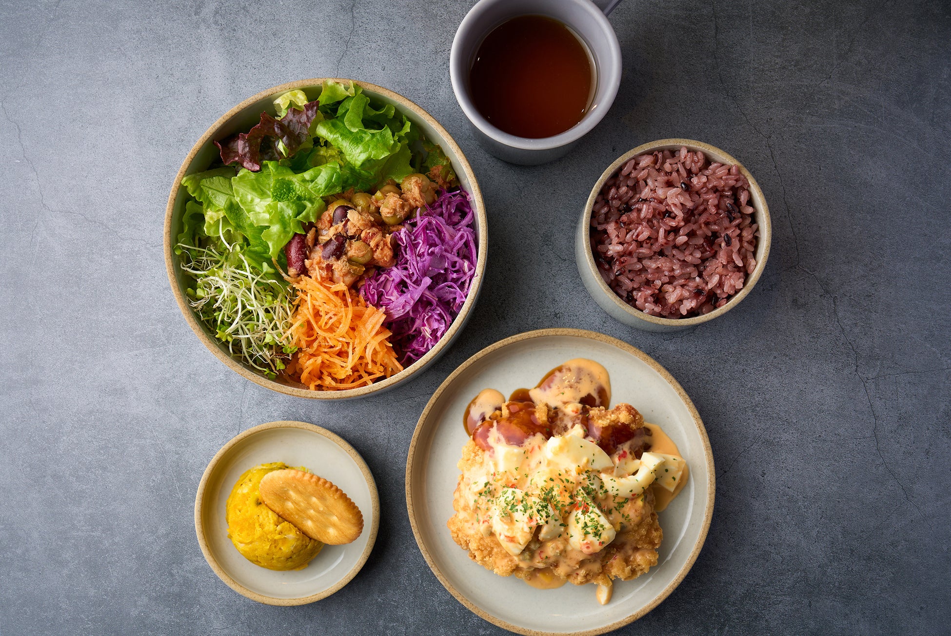 波佐見焼の器に盛られたのはたっぷりの色鮮やかなサラダボウルに、選べるメイン料理(全6種)。黒米ごはん、potto特製の能登のいしる出汁入り味噌汁、お野菜の副菜がついた、カラダにもココロにもうれしいギルトフリーなプレートをお楽しみいただけます。