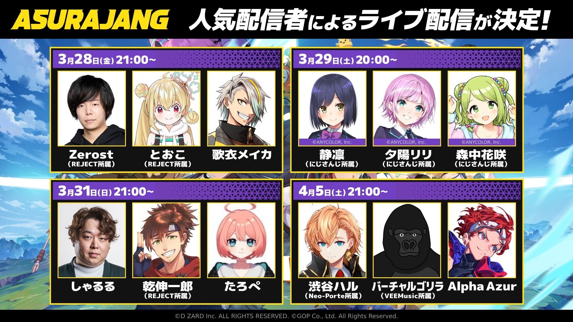 正式サービス開始を記念して、人気ストリーマー・VTuberによるライブ配信が決定しました。3人1組4チームの配信者が『ASURAJANG』のトリオモードをプレイし、白熱したバトルをお届けします。YouTubeまたはTwitchの各配信者チャンネルにて配信予定です。