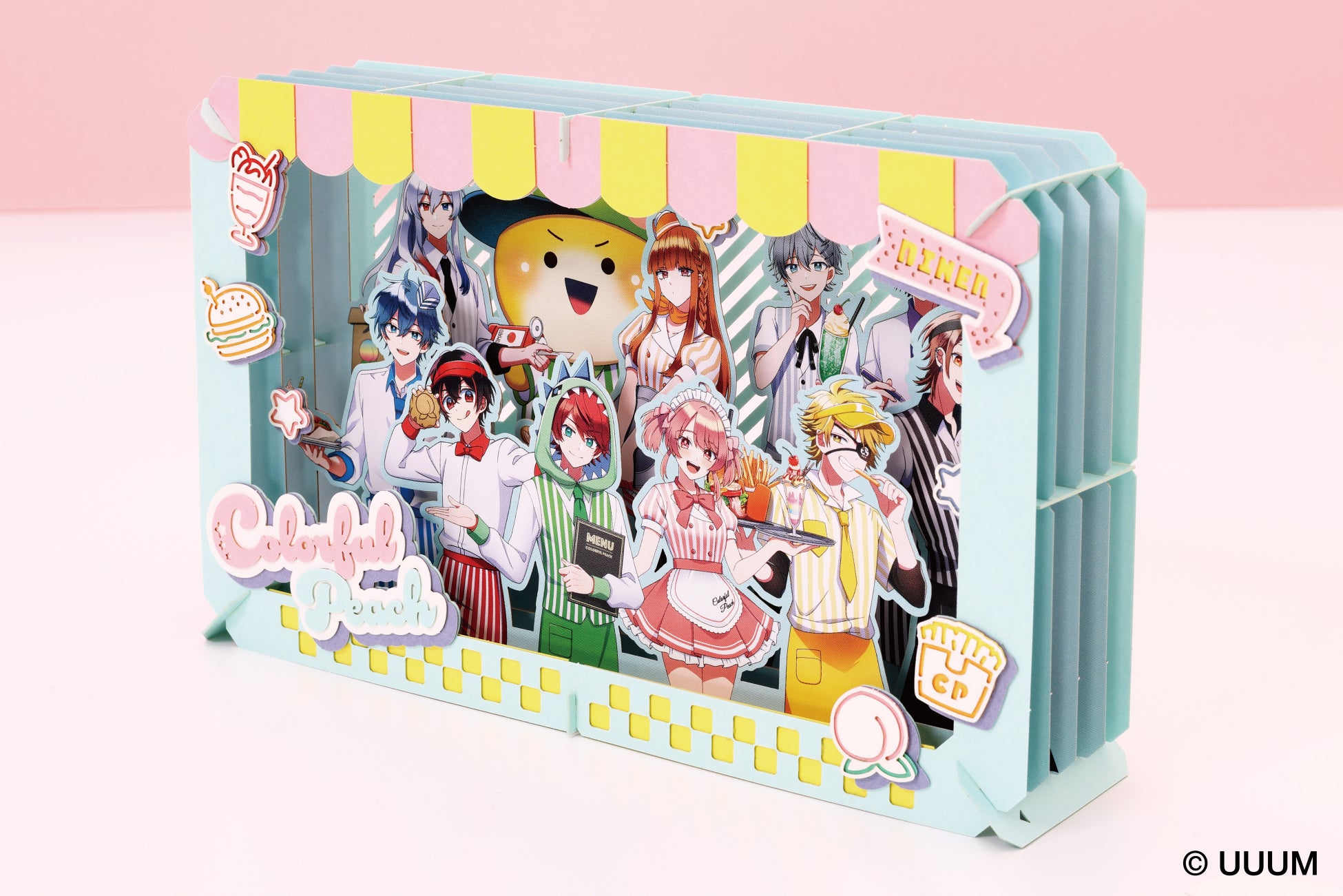 大人気ゲーム実況グループ『カラフルピーチ』が、エンスカイのペーパーシアターシリーズに登場!本商品は、エンスカイオリジナルの描き下ろしイラストを使用し、ダイナーをテーマにしたポップで楽しいデザインが特徴です。印刷仕様のため、初心者でも手軽に組み立てられる一方で、立体感のあるペーパークラフトならではの奥行きや作る楽しさも体験できます。さらに、『カラフルピーチ』のメンバーが勢揃いし、ファンにはたまらない特別なアイテムに仕上がりました。ペーパークラフト経験者はもちろん初めての方も、是非お楽しみください。