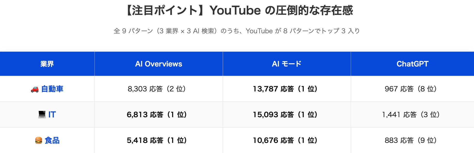 全 9 パターン(3 業界 × 3 AI 検索)のうち、YouTube が 8 パターンでトップ 3 入りを果たしました。特に AI モードでは全業界で 1 位を獲得し、動画コンテンツが AI 検索において極めて重要であることが明らかになりました。