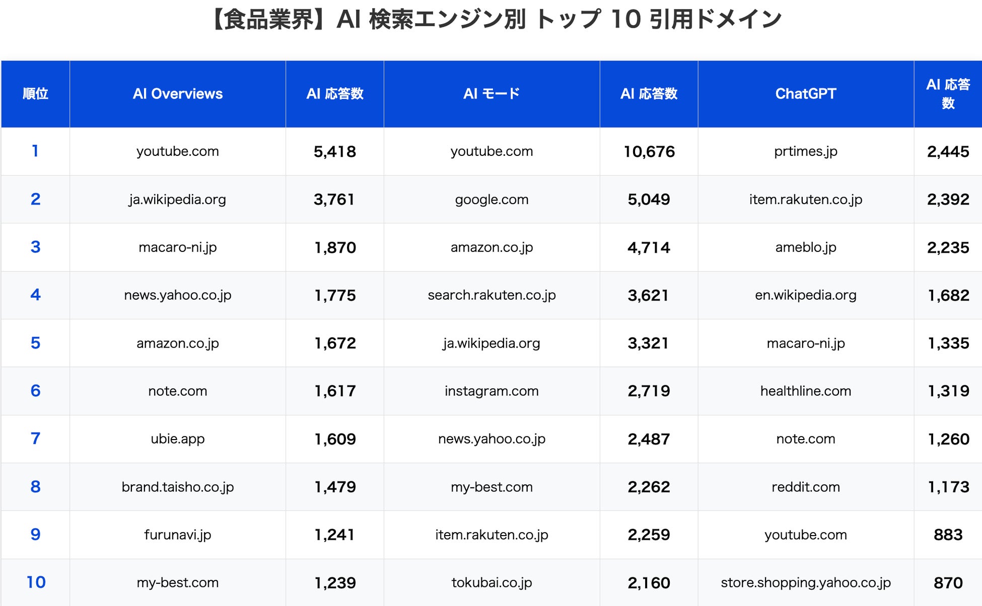 数値の意味: AI 応答数(各ドメインが AI 検索結果に引用された回数)