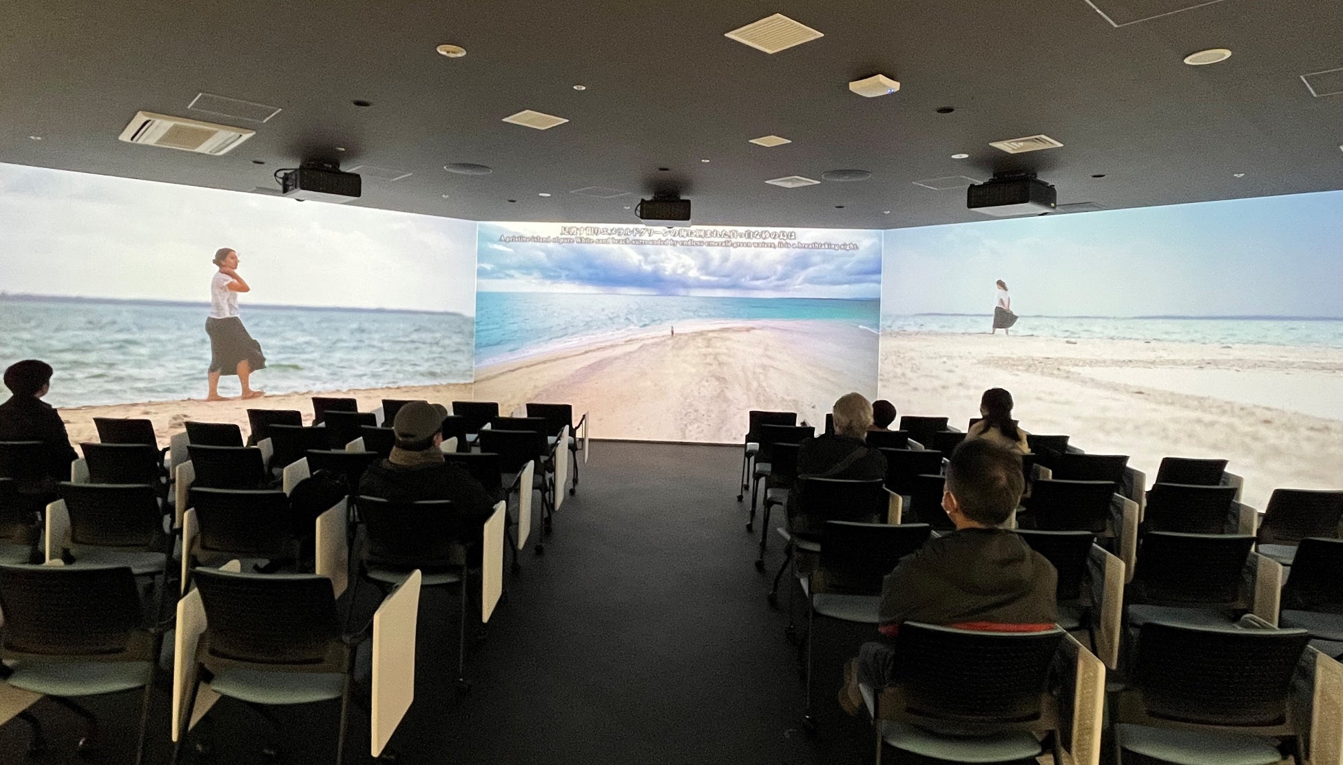 ゲートウェイホールには3面の「白い壁」があり、講演会やウェビナーで資料を投影したりオンライン参加者の姿を映したり多目的に活用可能です。特に、この「白い壁」は迫力ある没入型スクリーンとしても活用でき、昨年11月のオープン以来、「日本 ~海・大地・気候がもたらす様々な風土」と「日本海・竹島のアシカ猟」という2つの動画を一日数回ずつ上映してきました。