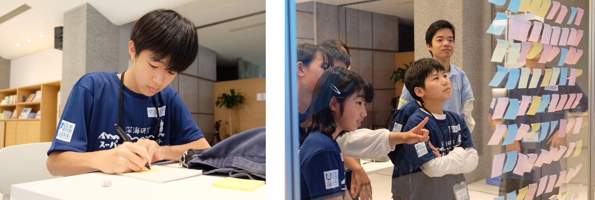 さらに、「深海といえば」というキーワードで、思いつくこと、もの、生物、疑問…なんでも自由に発想して付箋に書き込む「KJ法的ブレーンストーミング」に挑戦しました。ひたすら知っている生物の名前を書く子もいれば、疑問やイメージを書く子、集まった付箋を効果的に貼り付ける子など、思い思いに「深海」を発想し、今後に繋げるアイスブレイクタイムとなりました。