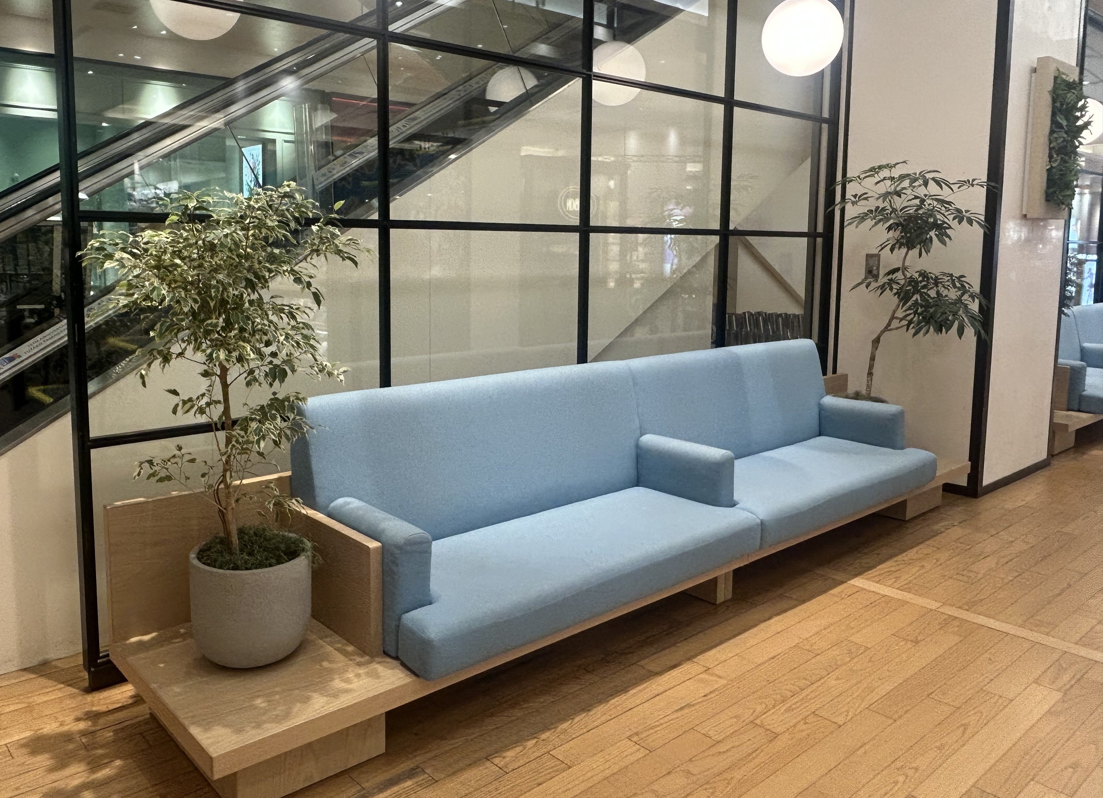 「休憩ができるスペースが欲しい」とのお客さまのお声から、館内10カ所にレストスペースを新設しました。エコフレンドリーな素材を使用した大きなソファと温かみのあるペンダントライトにより、