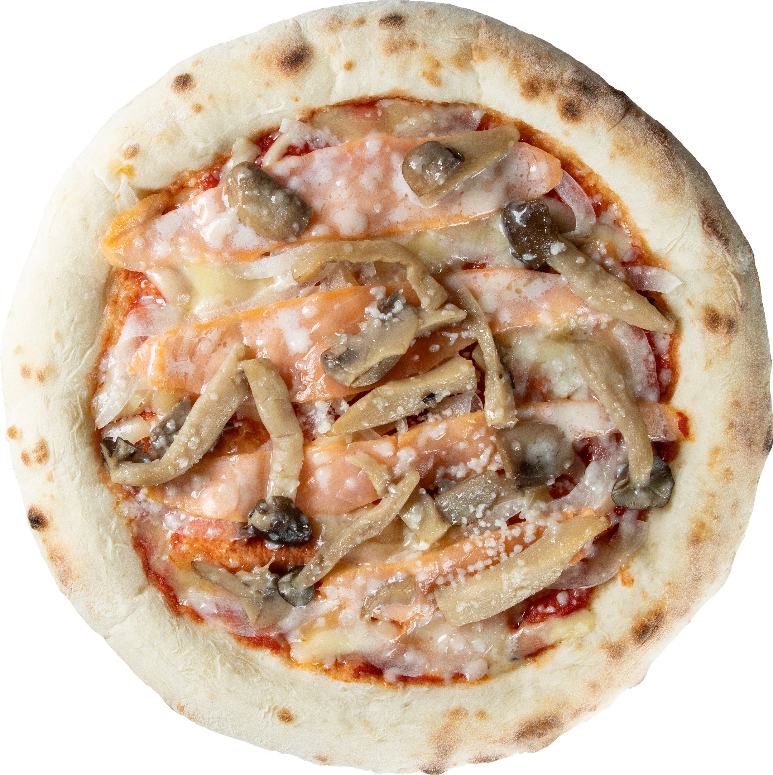 オリジナルのトマトベースに、ノルウェー産の自家燻製サーモン、丁寧に煮詰めた旨味たっぷりの国産きのこ3種(しめじ・エリンギ・マッシュルーム)をトッピング。自信を持っておすすめする渾身の一枚です。