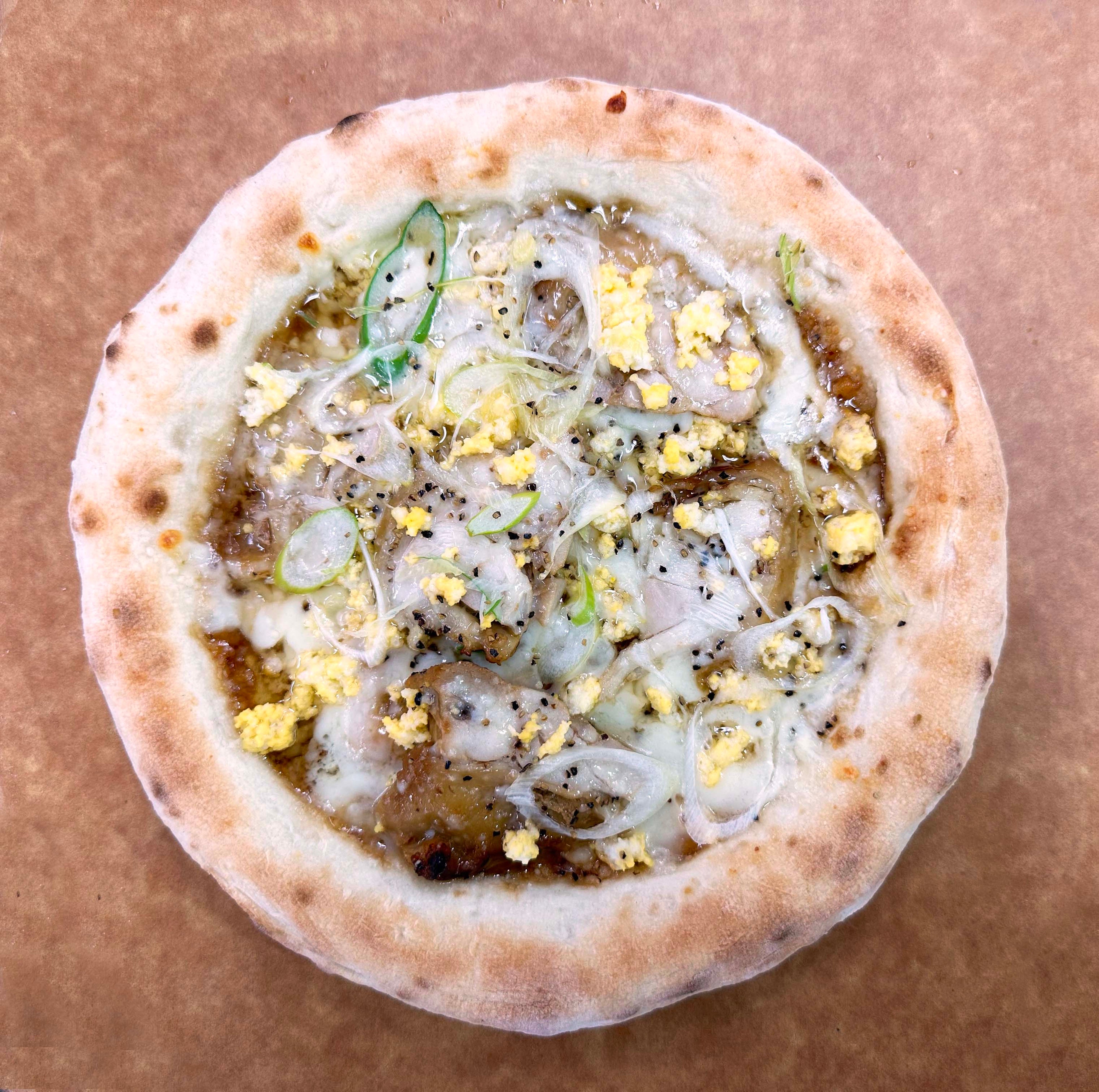 オリジナルのバジルベースに、ブラックタイガー(海老)と、シャキシャキ食感のアスパラガスを贅沢にのせた、食べ応えが魅力の一枚。焼き上がりの香ばしい海老の香りとブラックペッパーのアクセントが食欲をそそります。