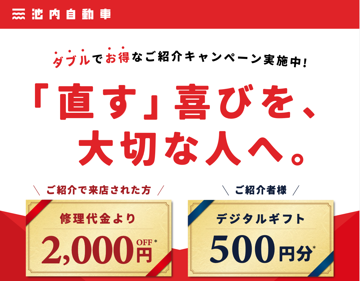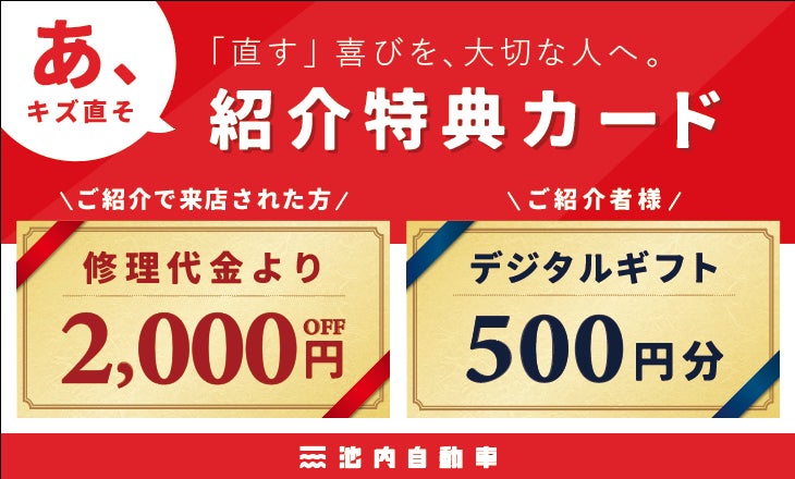 【地域で広がる安心の輪】板金塗装の池内自動車が「ご紹介特典カード」を導入。紹介された方は修理代2,000円OFF、紹介者にはデジタルギフトを贈呈