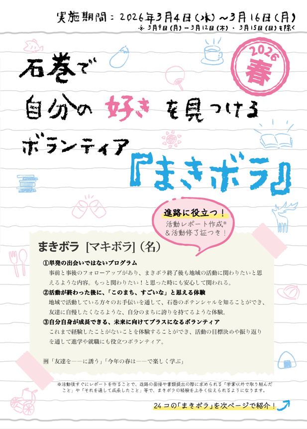 【宮城県】高校生・大学生がボランティアを通じて、地域の中で自分の“好き”を探究する「まきボラ」、2026年春の活動スタート!