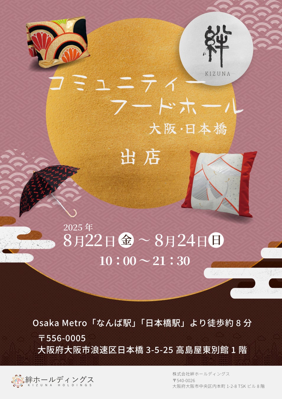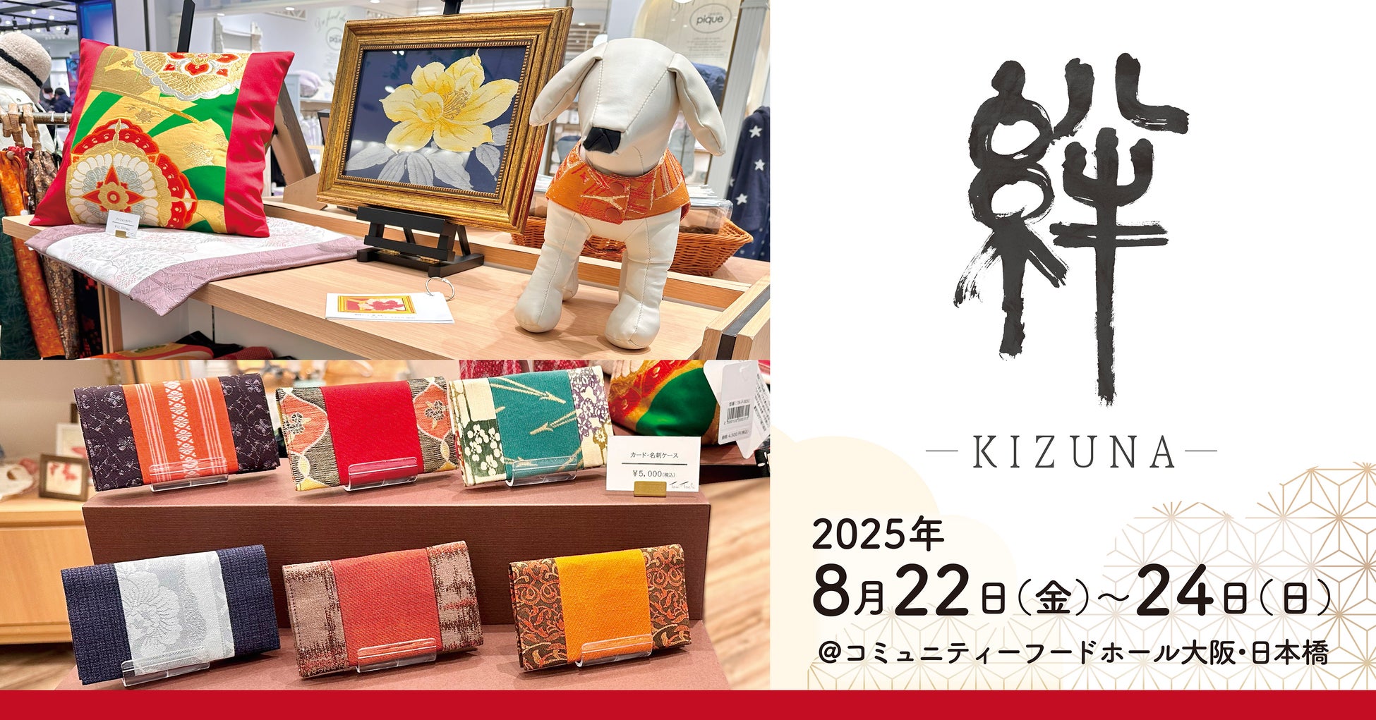 2025年8月22日(金)~24日(日)の3日間、コミュニティーフードホール大阪・日本橋(高島屋東別館)にてアップサイクル和雑貨ブランド「絆」が期間限定出店します。障害のある方々が丁寧に手作業で仕上げた一点物のハンドメイド製品で、着物や帯を活用した和雑貨や刺繍小物を販売します。