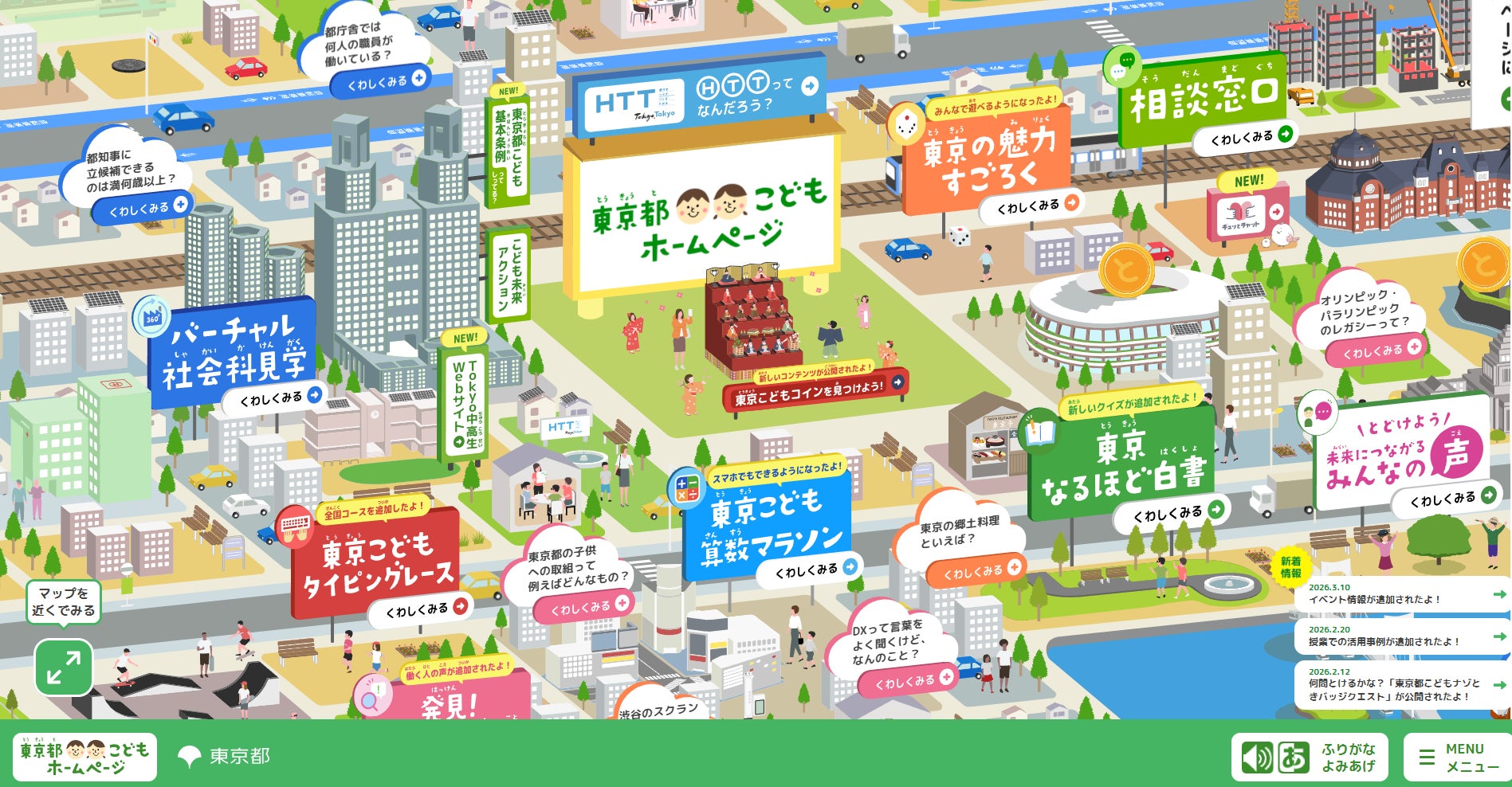 「東京都こどもホームページ」は、令和4年度に公開され、子どもたちの声を基に継続的にアップデートを行い、今年度は、一日あたり最大約9万人が利用し、年間閲覧数2億ページビューを超える大人気のホームページです。