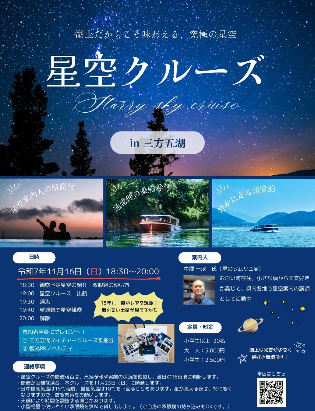 令和7年11月16日に、三方五湖を舞台に、幻想的な時間を体験する「星空クルーズ」を開催します。静粛性の高い遊覧船で、星空案内人による解説とともに特別な夜をお楽しみください。