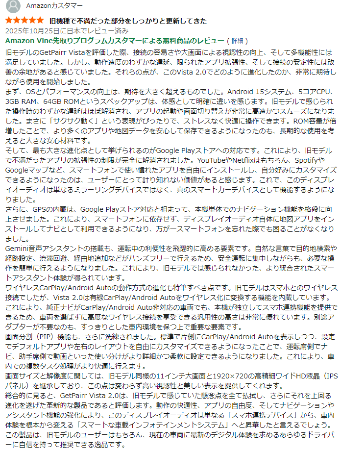 「旧機種で不満だった部分をしっかり改善」「操作がサクサク」「ナビと動画を同時に使える」など、