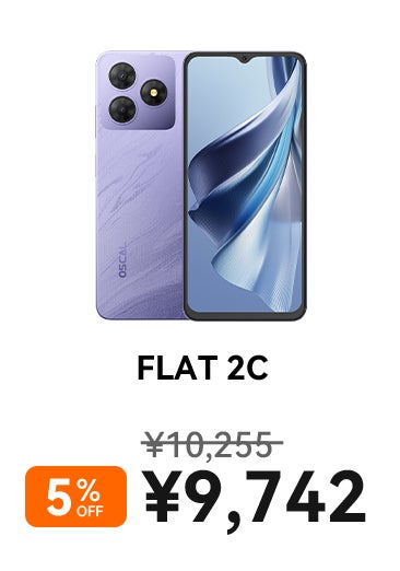 より手頃な価格帯を求める方には「OSCAL Flat2C」がおすすめです。6.56インチの大画面に加え、5000mAhのバッテリーとAI対応のデュアルカメラを搭載。デュアル4G対応で日常使いに十分な性能を持ちつつ、コンパクトで扱いやすいモデルです。セール期間中はなんと一万円以下で大変お得に手に入ります。