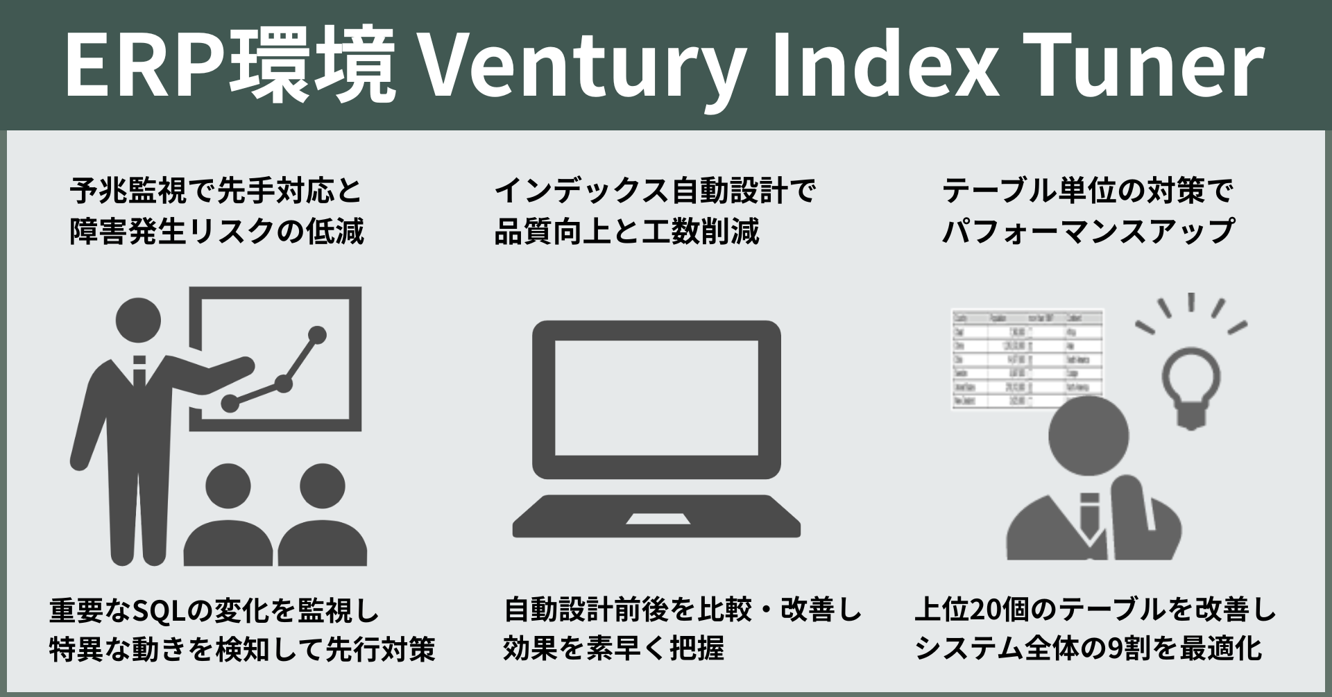 大量のSQLが実行されるJDE環境では、個別対応のチューニングでは、全体の負荷を把握しきれないことがあります。Ventury Index Tunerは、すべてのSQLを分析し、テーブル単位で傾向を整理することで、根本的な性能改善を支援します。