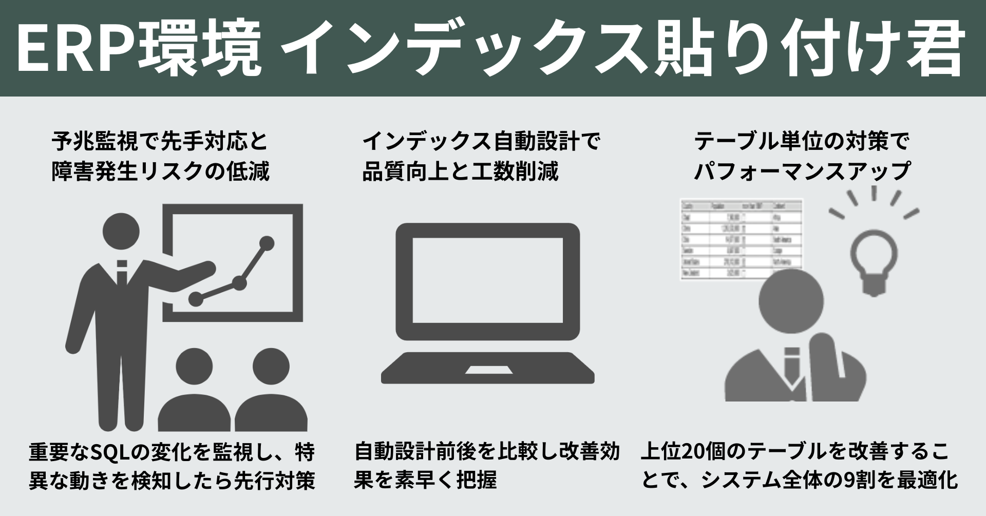 ERP(統合基幹業務システム)の性能改善において、特に改善の決定打となるのがデータベースサーバの存在です。データベースにおけるディスクスキャン量の増大がシステム応答性能に最も影響を与えるからです。そこで気にかけていきたいのがデータベースのインデックス設計です。性能への影響が大きい一方で、判断が担当者の経験や感覚に依存しやすい領域でもあります。