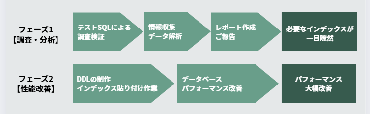 フェーズ2では報告内容に基づきDDL制作・インデックス適用までを一貫して実施し、パフォーマンスを改善します。