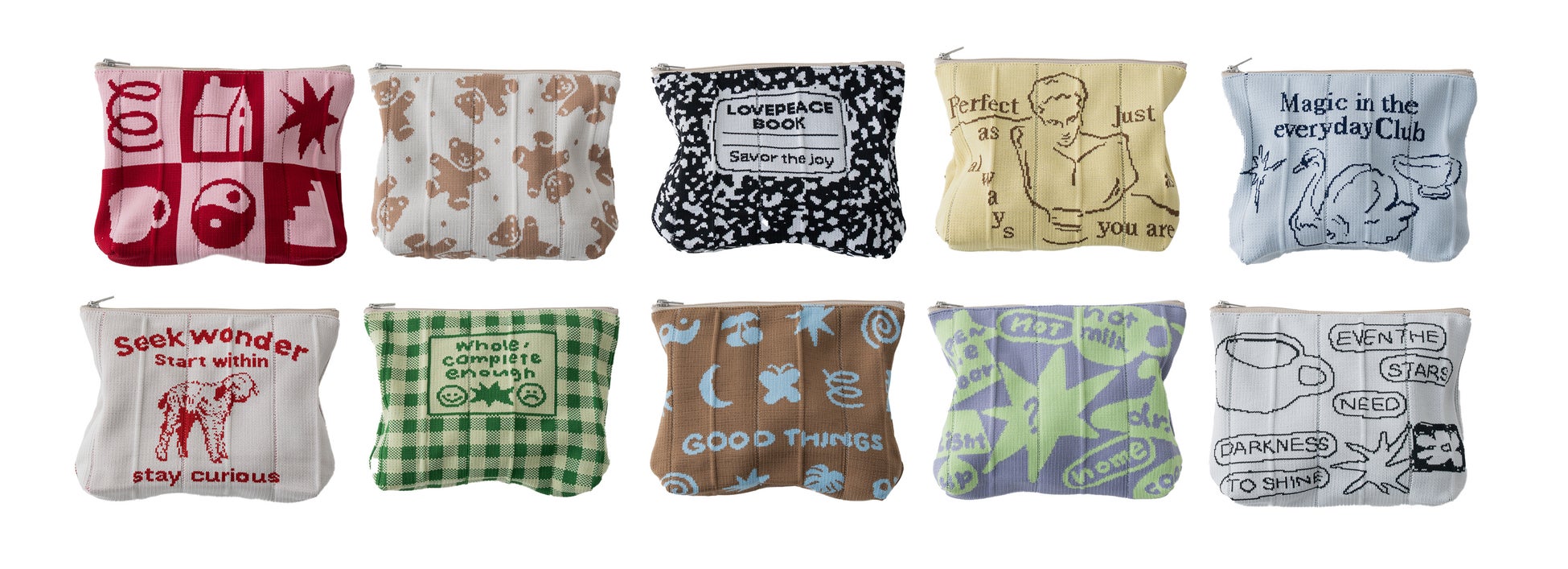 dalazdaakaaによって施された手編みのような柄が溢れたデザインが魅力の「Coiny」は、コインケースとしてはもちろん、アクセサリーやリップ、常備薬などの持ち運びにも頼れる作品。ポケットやミニバッグにも収まるコンパクトなつくりで、汚れても丸洗いできるのがポイント。ちょっとしたギフトにもおすすめです。