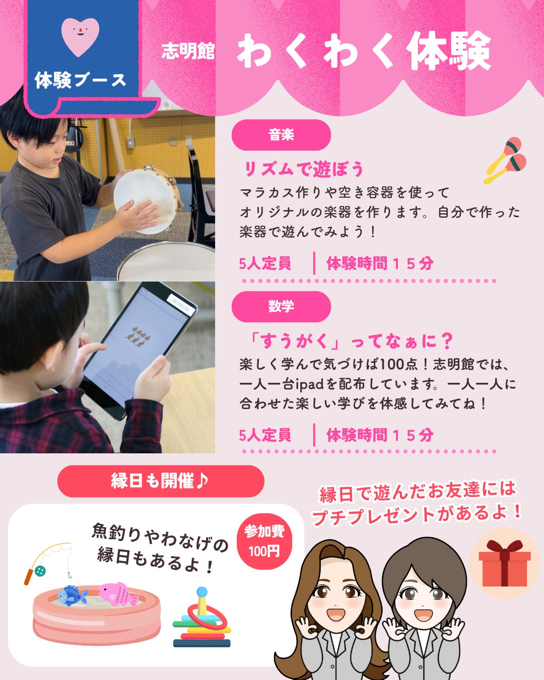 志明館ならではの教育を親子で体験して頂きます。授業体験ができるブースコーナーでは、音楽・工作・科学・ブロック玩具・iPadで数学のコーナーを準備。志明館では基礎基本を身につける土台教育に加えて、非認知能力を蓄える感性教育を大切にしています。その一端を体感してみてください。