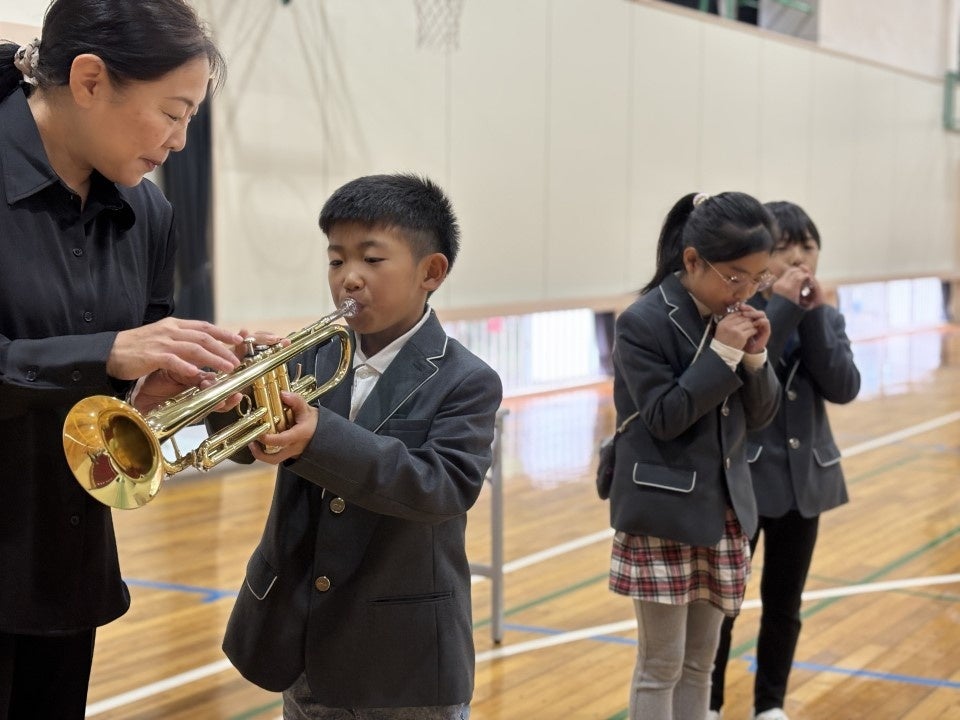 芸術鑑賞会で生徒へ楽器演奏のレクチャー