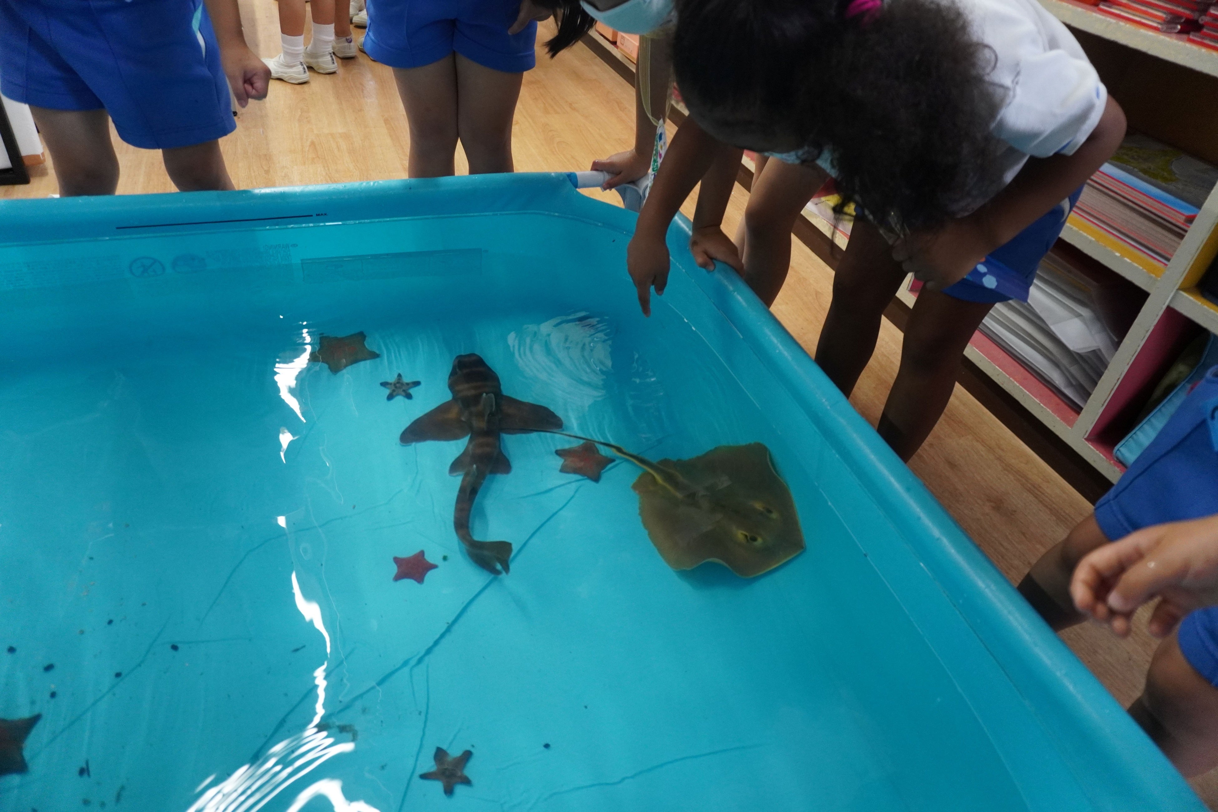背中をやさしくなでることで、肌の質感や泳ぐ姿を間近で観察いただけます。