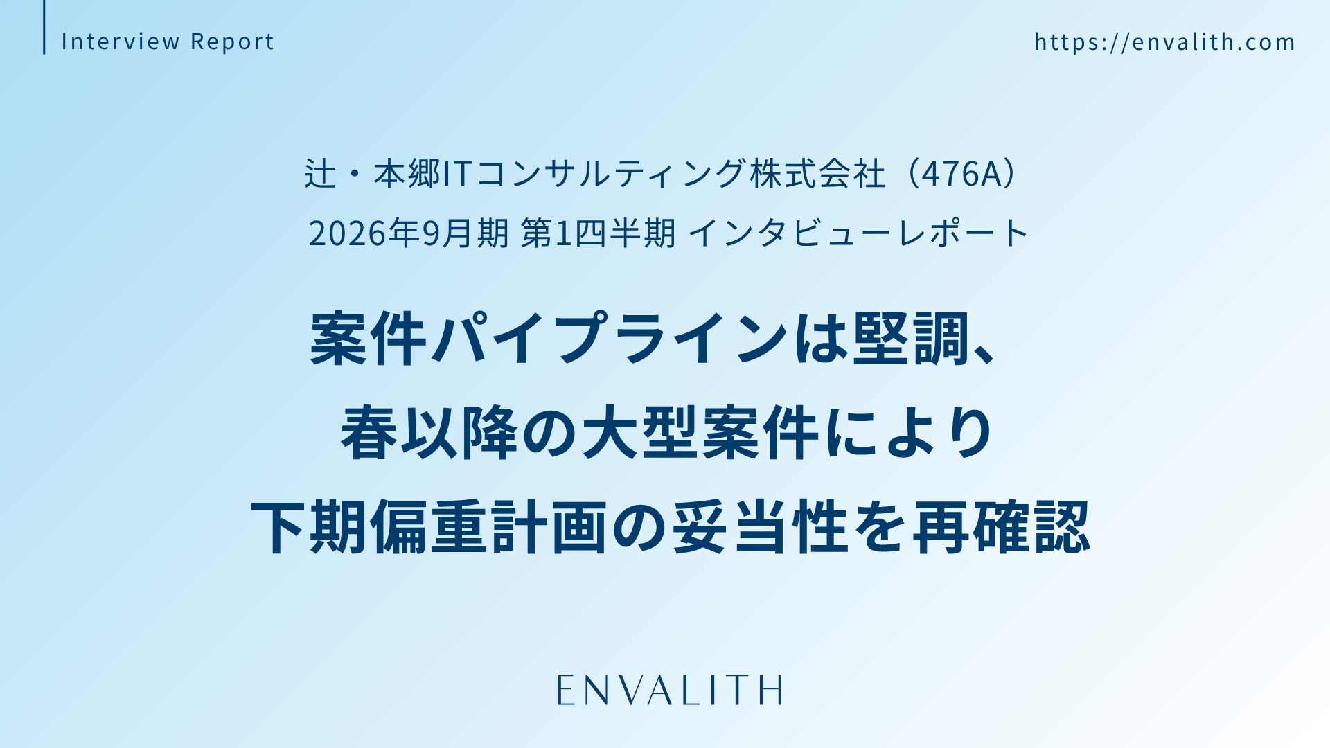 次世代型の株式リサーチ・プラットフォームを展開する株式会社エンヴァリス(本社:東京都渋谷区、代表取締役社長:河井 浩一、以下「当社」)は、辻・本郷ITコンサルティング株式会社(本社:東京都渋谷区、代表取締役社長 黒仁田 健、証券コード:476A、以下「辻・本郷ITコンサルティング」)の2026年9月期 第1四半期 インタビューレポートを配信いたしました。