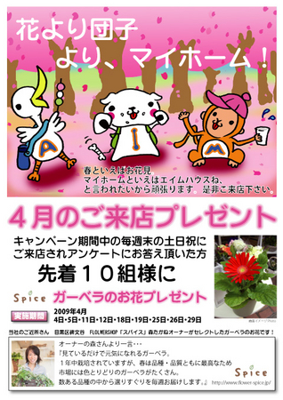 なお、4月も当社では恒例のご来店キャンペーンを実施いたします。4月の土曜、日曜、祝日に来店されたお客さま先着10組の方に、この時期品質、品種が最高で色もいちだんと美しいガーベラの花束をプレゼントいたします。キャンペーン詳細は、当社のWEBサイトでもご覧になれます。数に限りがございますので、ぜひお早めにお越しくださることをお勧めします。