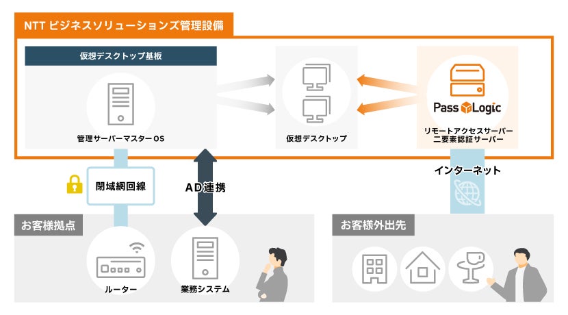 PassLogicは、外部のインターネット環境からNTTBS社のデスクトップ環境へ接続する際の認証部分に採用されています。