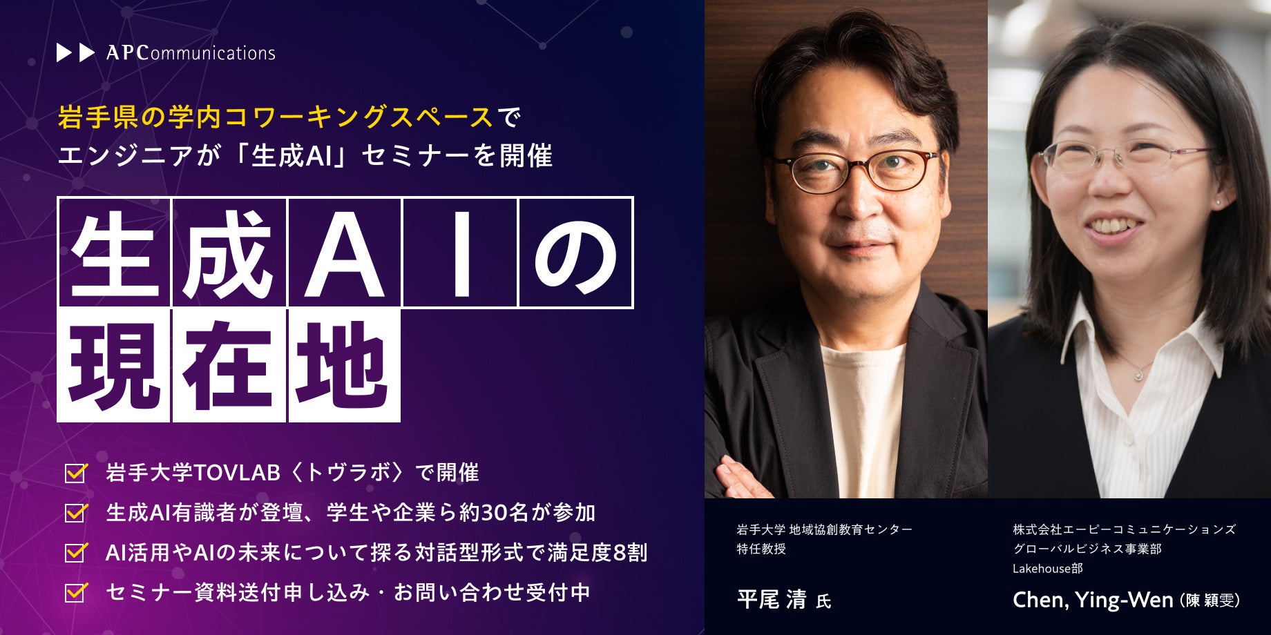 株式会社エーピーコミュニケーションズ(本社:東京都千代田区、代表取締役:内田武志、以下「当社」)は、岩手県初の大学内コワーキングスペースとして誕生した岩手大学「イーハトーヴ協創ラボ」の開所記念の取り組みとして、2024年11月26日(火)に当社のITエンジニアが岩手大学 地域協創教育センターとの協働で、対話型セミナー「生成AIの現在地」を開催したことをお知らせします。