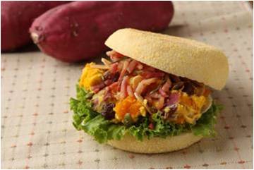 ■概要:ローズマリーとともにローストし甘味の強い栗カボチャと、オーブンでじっくり焼き上げたサツマイモ。そこに、オニオン・キャラメリゼやベーコンなどをサワークリームで和えたものを合わせ、マフィンでサンドしました。女性におススメのヘルシーな一品です。