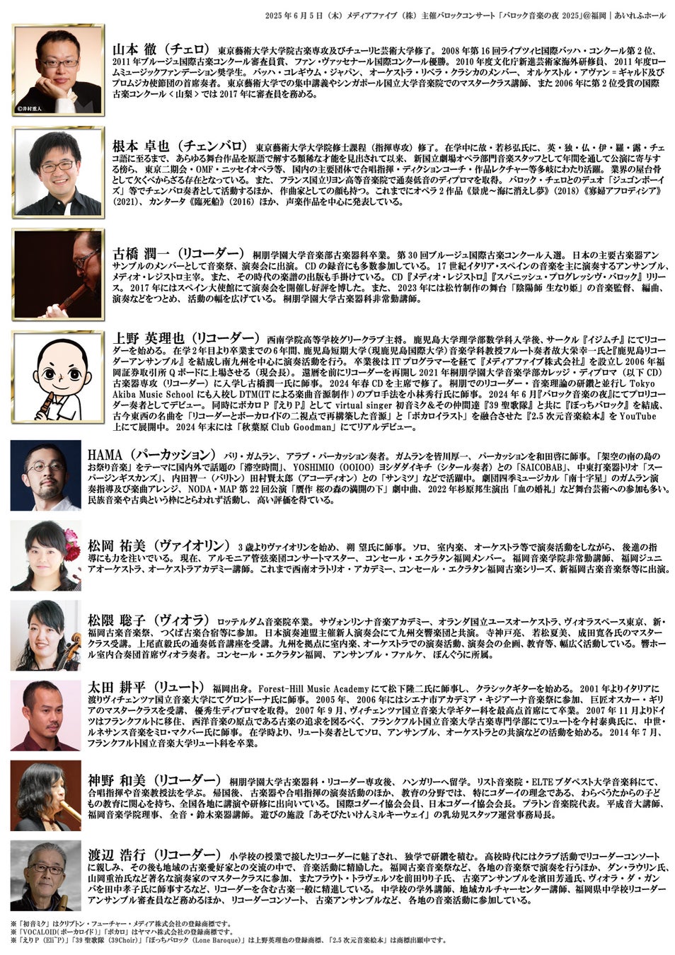 本公演は、2024年に好評を博したシリーズの第2弾として、J.S.バッハやH.パーセルなどの名曲を総勢10名の実力派演奏家が奏でます。さらに今回は、新設リコーダーコンソート「ザ・プログレッシヴ・バロッカーズ:コンソートFUKUOKA」が初登場。メディアファイブ創業者である上野英理也も出演し、企業文化と音楽の融合による新たなCSRの形を提示します。