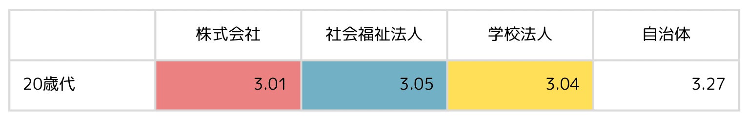 本調査では、全口コミの中から20代の保育士が投稿した口コミだけを調査対象とし、20個の口コミカテゴリーごとに、保育園・幼稚園を運営する「株式会社」「社会福祉法人」「学校法人」の評価点数を比較しています。そして、「1位(青色)」「2位(黄色)」「3位(赤色)」の色付けを行い、それぞれの職場の強み・弱みといった特徴を整理しています。(参考情報として公立の保育園・幼稚園を運営する「自治体」も公開)