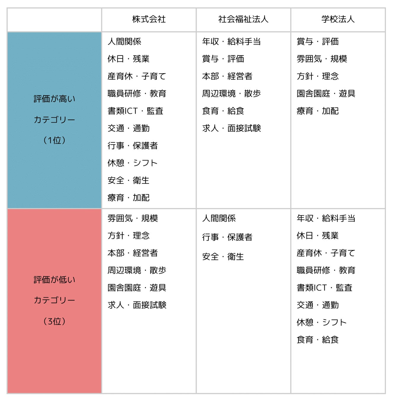 ※保育士職場口コミ全20カテゴリー(人間関係、雰囲気・規模、年収・給料手当、賞与・評価、休日・残業、産育休・子育て、職員研修・教育、方針・理念、周辺環境・散歩、園舎園庭・遊具、交通・通勤、行事・保護者、書類ICT・監査、求人・面接試験、休憩・シフト、本部・経営者、安全・衛生、園長主任・運営、食育・給食、療育・加配)