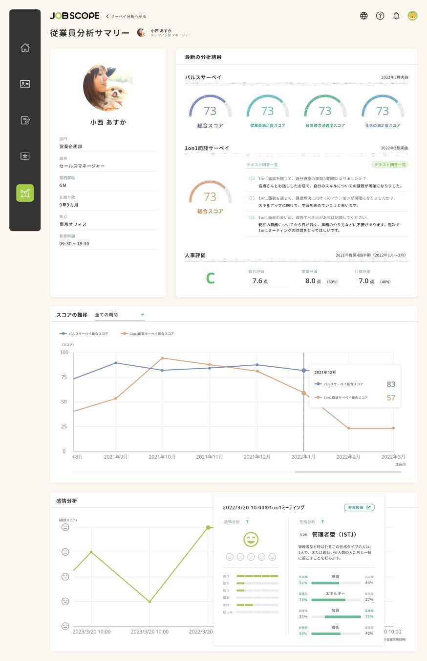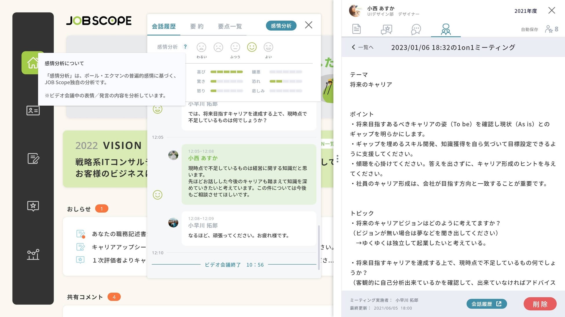 JOB Scopeは、経営理念から組織・職務定義の上、採用・配置・キャリア開発、目標管理・1on1フィードバック面談・評価・賃金査定・サーベイ・評価分析が包括的かつシームレスに連動するタレントマネジメントサイクルを実現します。今回提供するAIによる面談記録・要約・面談者の感情分析は、日本企業に不足するフィードバック面談をオンラインで簡単にいつでも、どこからでも実施できる機能です。