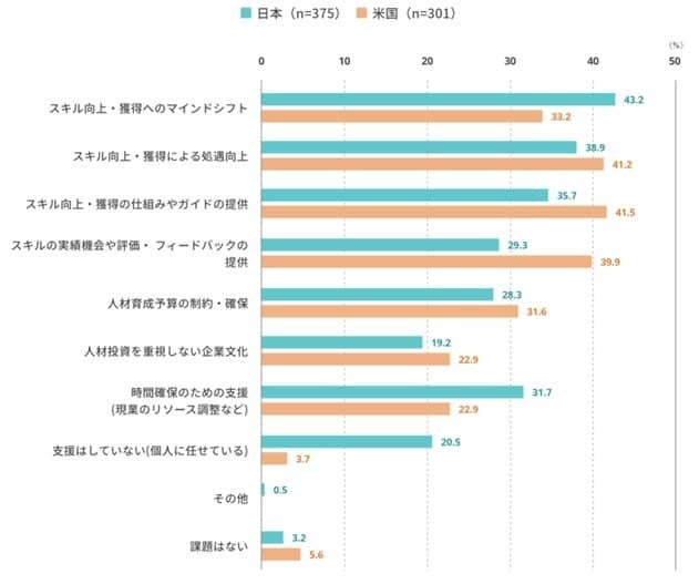 独立行政法人情報処理推進機構(IPA)が2023年2月に発表したDX白書2023 『進み始めた「デジタル」、進まない「トランスフォーメーション」』では、日本企業のデジタルトランスフォーメーションが遅れている事がデータを交えて指摘されています。第4部第1章「日米調査にみるDXを推進する人材」の中で、「スキル実績機会や評価・フィードバックの提供」は、日本は米国に比べて割合が著しく低いと指摘。日本企業におけるDX人材育成に関する支援が遅れている事が明らかになっています。
