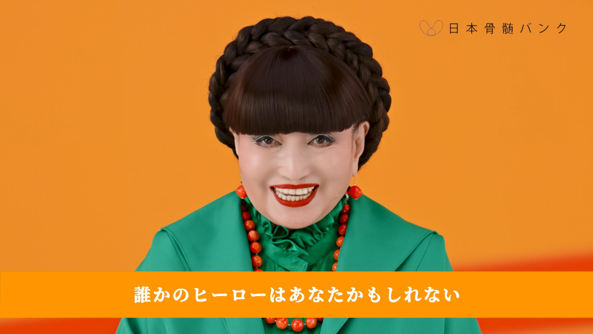 鮮やかなグリーンのセットアップに「#つなげプロジェクトオレンジ」にちなんだオレンジ色のアクセサリーを合わせた黒柳さんが「誰かのヒーローは、あなたかもしれない」と語りかけます。思いを同じくする里咲さんが、骨髄バンクが造血幹細胞の提供ドナーを必要としていることを伝えます。