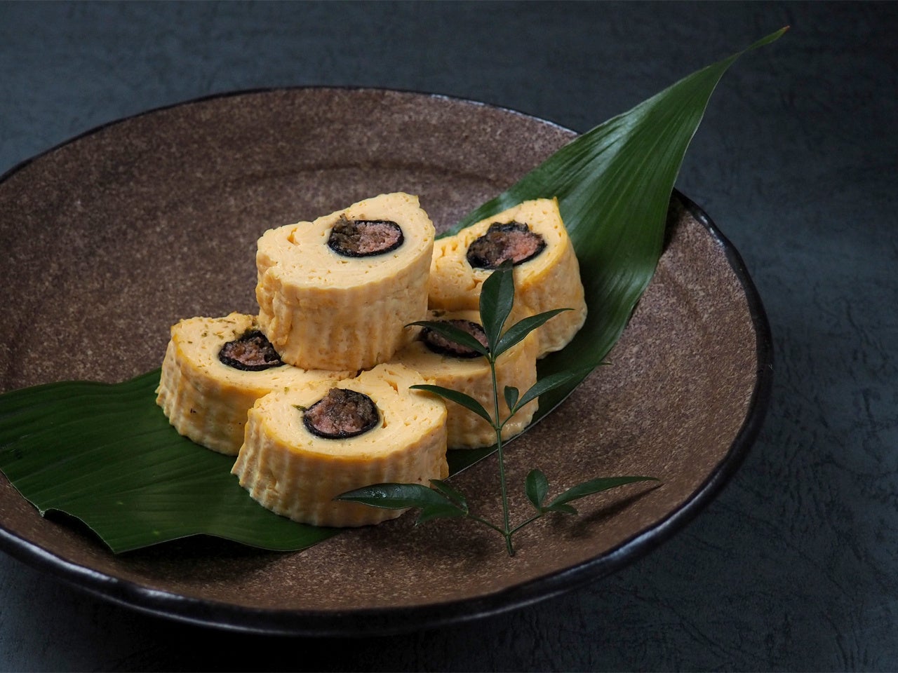 自慢のはまぐり出汁巻たまごに福岡有明のりと明太子を入れ、贅沢な出汁巻たまごに仕上げました。